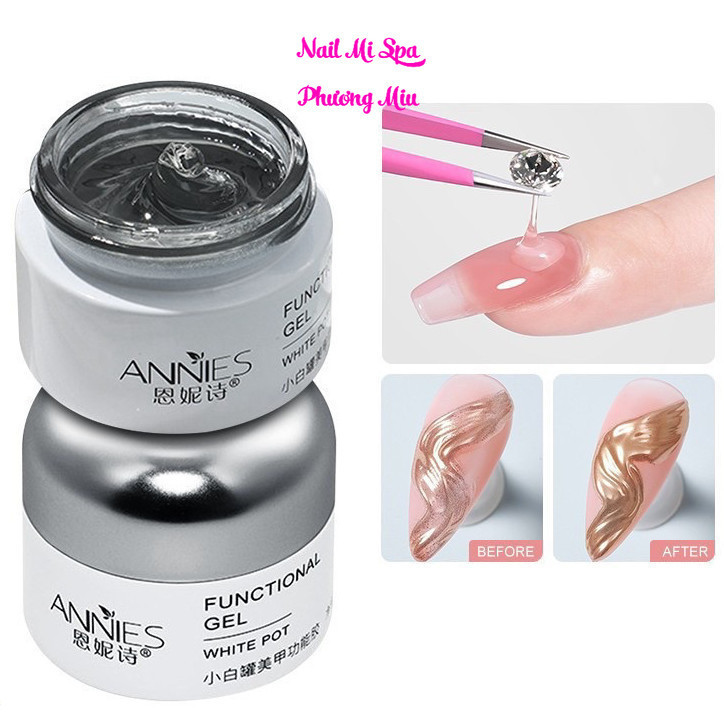 Gel Vẽ Nail Thuỷ Tinh ANNIES 20g Đậm Đặc Không Chảy Đính Charm Đá, Gel Vẽ Nail Nổi 3D Tráng Gương Móng | Nail-Mi-Spa Phương Miu* Thông tin sản phẩm - Gel vẽ nổi thủy tinh annies được dùng để vẽ họa tiết nổi 3D, chà tráng gương, đính charm đá- Chất gel vẽ nổi annies đặc, không chảy giúp cho việc trang trí móng dễ dàng, nhanh chóng.- Gel vẽ nổi thủy tinh annies bắt tráng gương cực tốt, độ kết dính cao, không gây chảy, nóng móng- Tạo hình giọt sương, dùng như top giọt sương nhưng chất gel đặc hơn * Cách sử dụng+ Cách 1: Gel nổi tráng gương- Sơn gel lớp nền xong, Sơn top lì không lem hoặc nhám mịn bề mặt Sơn gel, dùng cọ nét vẽ đường gel nổi Annies- Hơ đèn 30s - chà tráng gương lên gel- Sơn top+ Cách 2: Vẽ hoa, gel nổi- Vẽ họa tiết ở bên dưới, dùng cọ nét tán gel nổi Annies ở phần muốn làm nổi.Có thể tán 1 lần hoặc nhiều lần* Bảo quản:-Bảo quản nơi khô ráo, thoáng mát, tránh xa đèn hơ và nguồn nhiệt-Để xa tầm tay trẻ em và thú nuôiNail-Mi-Spa Phương Miu chuyên cung cấp đồ nghề móng chất lượng giá rẻ